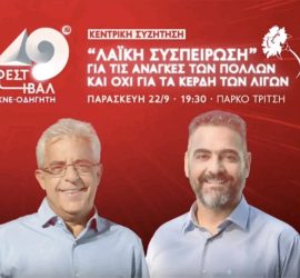 Νέα Ομιλίες - Άρθρα Περιοδείες - Συγκεντρώσεις Περιφερειακές - Δημοτικές Εκλογές 2023 Παρασκευή 22/9, 19:30, στο 49ο Φεστιβάλ ΚΝΕ – Οδηγητή, η κεντρική συζήτηση με τον Γιάννη Πρωτούλη και τον Νίκο Σοφιανο […]