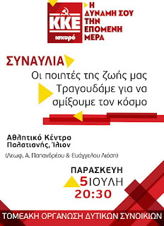 κόσμο» διοργανώνει την Παρασκευή 5 Ιούλη η ΤΟ Δυτικών Συνοικιών της ΚΟΑ του ΚΚΕ.