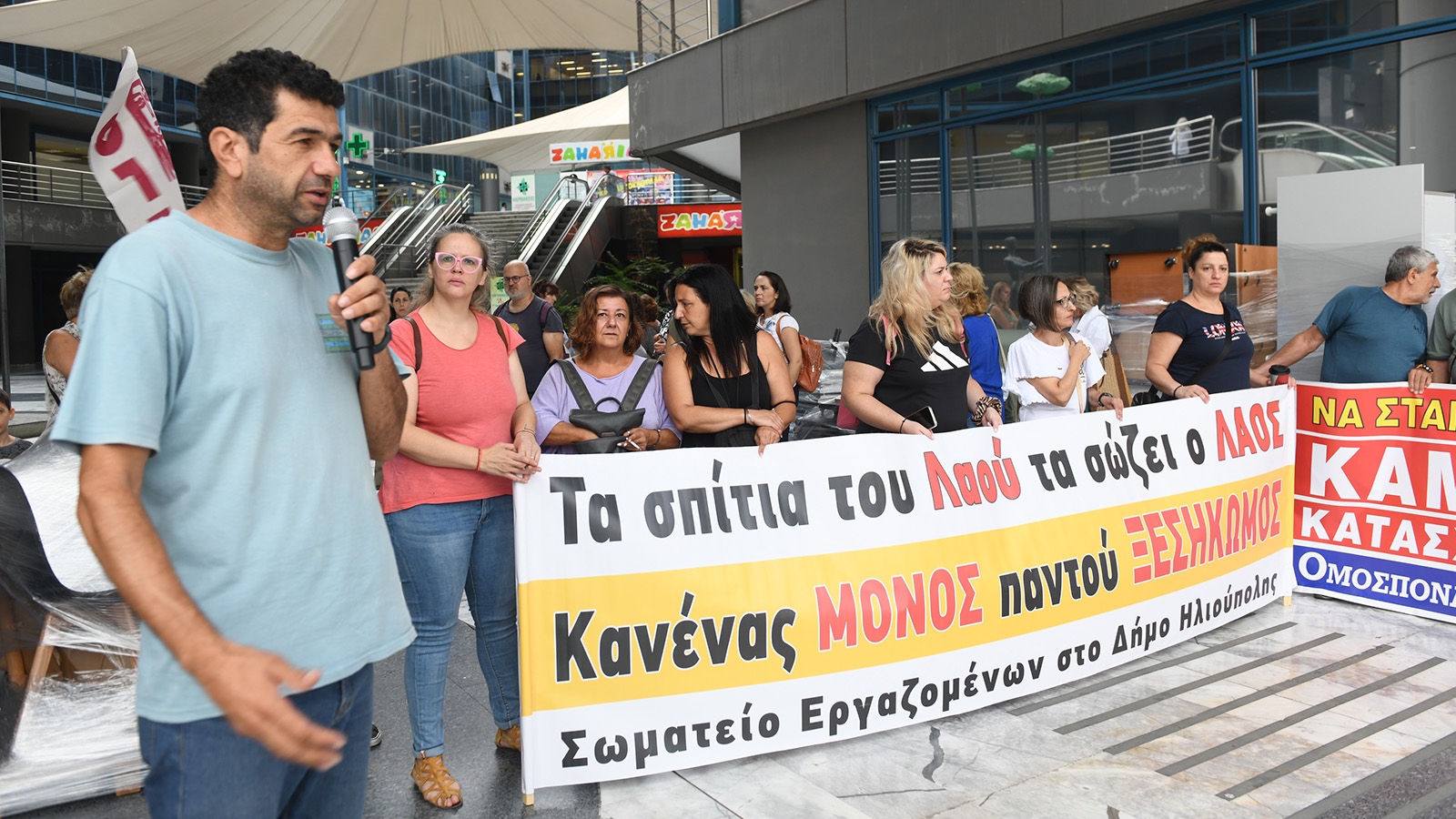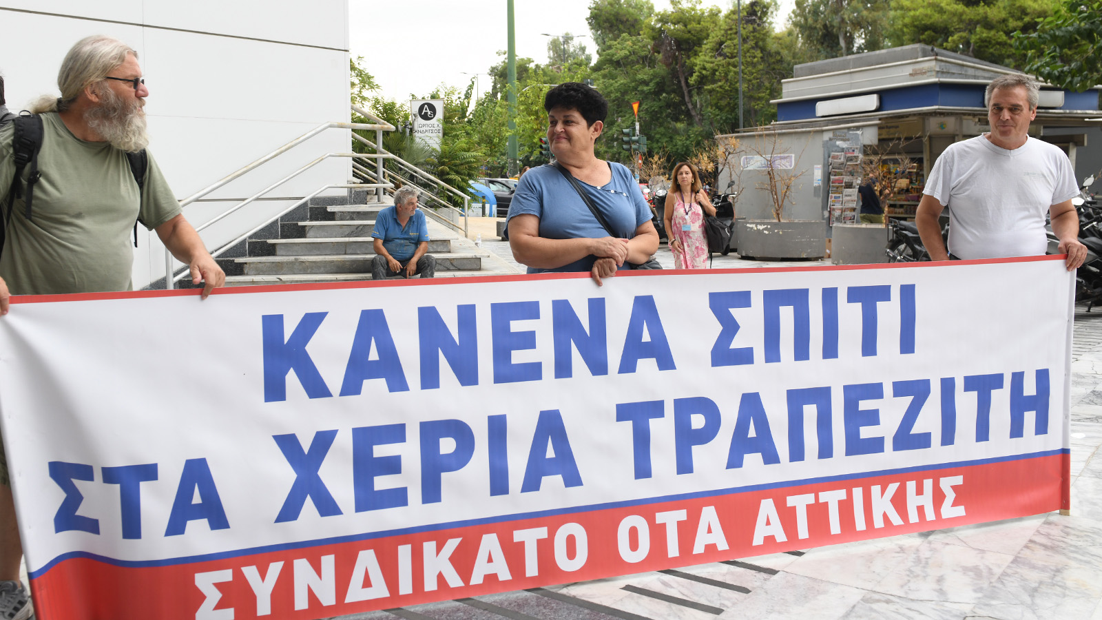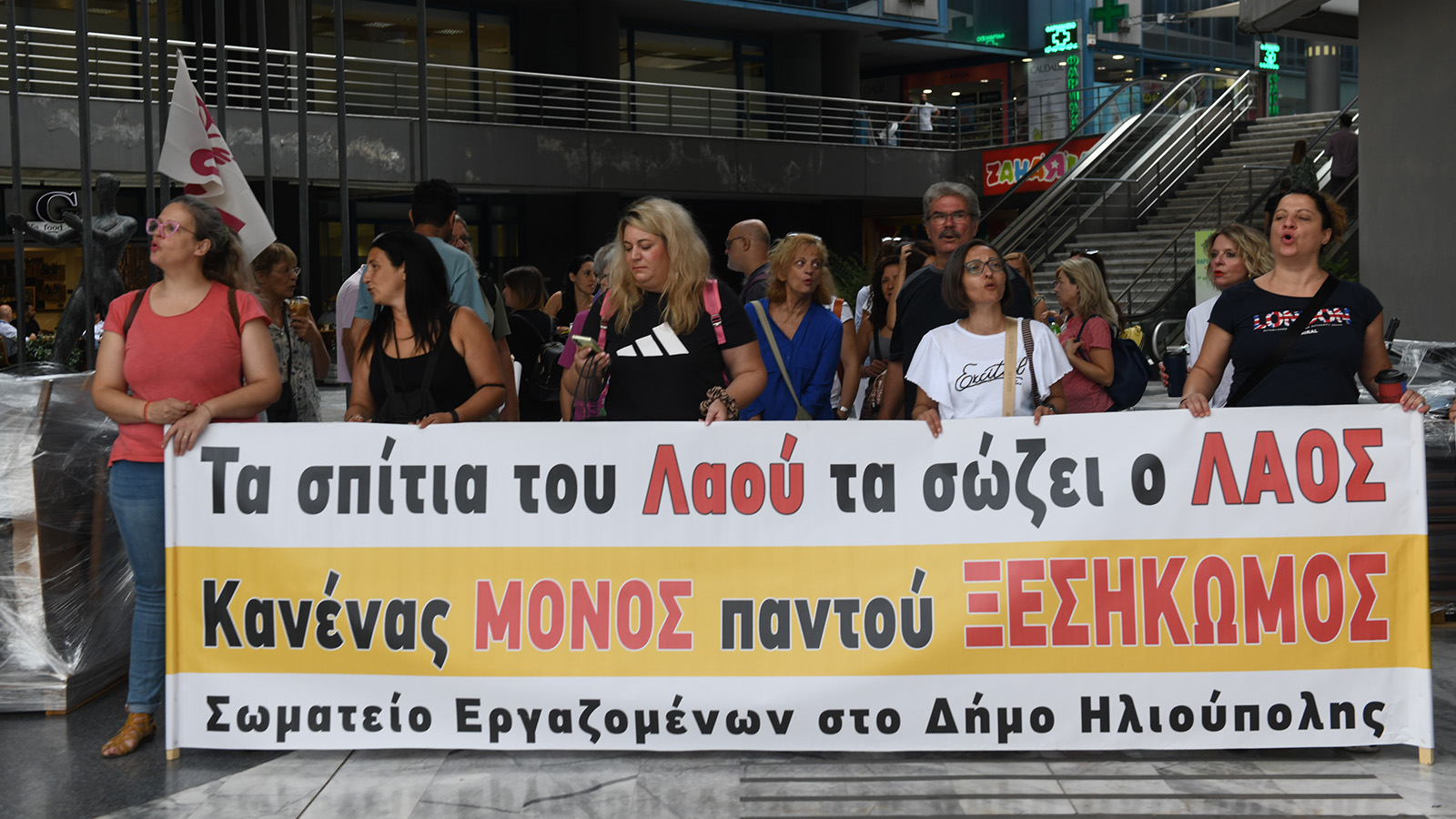 «Τα σπίτια του λαού τα σώζει ο λαός, κανένας μόνος, παντού ξεσηκωμός»: Με το σύνθημα αυτό η Ομοσπονδία Βιοτεχνικών Σωματείων Αττικής (ΟΒΣΑ), η Ένωση Συνταξιούχων ΟΑΕΕ, ο Σύλλογος Εργαζομένων Δήμου Ηλιούπολης και το Συνδικάτο ΟΤΑ Αττικής συγκεντρώθηκαν έξω από τα γραφεία της εταιρείας που διαχειρίζεται «κόκκινα» δάνεια και βγάζει στο σφυρί την πρώτη κατοικία.