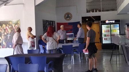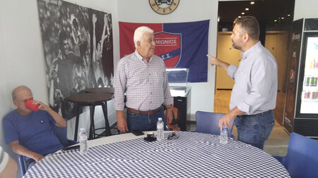 Στην περιοδεία στις αθλητικές εγκαταστάσεις του Πανιωνίου, συναντήθηκαν και με τον Πάνο Βέλιο από το σύλλογο, ο οποίος ανέδειξε τα προβλήματα του συλλόγου, το κόστος συντήρησης των εγκαταστάσεων και το πως δημοτικές και περιφερειακές αρχές τους έχουν γυρίσει την πλάτη και δε βοηθούν το σύλλογο. Χαρακτηριστικά αναφέρθηκε πως με το κλείσιμο του ΕΑΚΝ του Αγίου Κοσμά στο Ελληνικό, οι αθλητικές εγκαταστάσεις του Πανιωνίου είναι οι μόνες που διαθέτουν κλειστό στίβο σε όλα τα Νότια Προάστια. Σύλλογοι όπως ο Πανιώνιος με 3600 αθλητές πρέπει να βγουν μπροστά, να διεκδικήσουν, όπως κάνουν και σήμερα οι άνθρωποι που τον διοικούν.