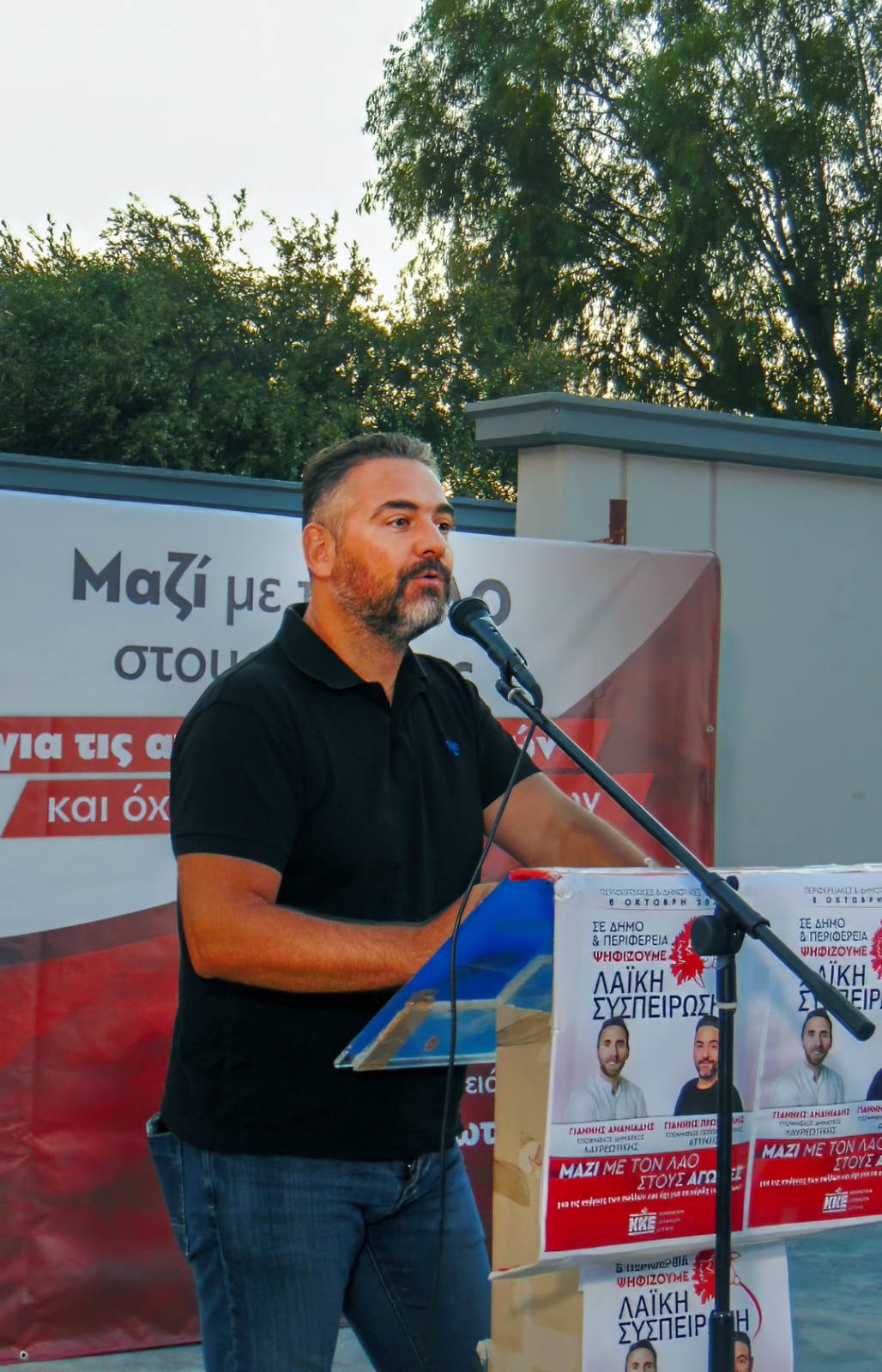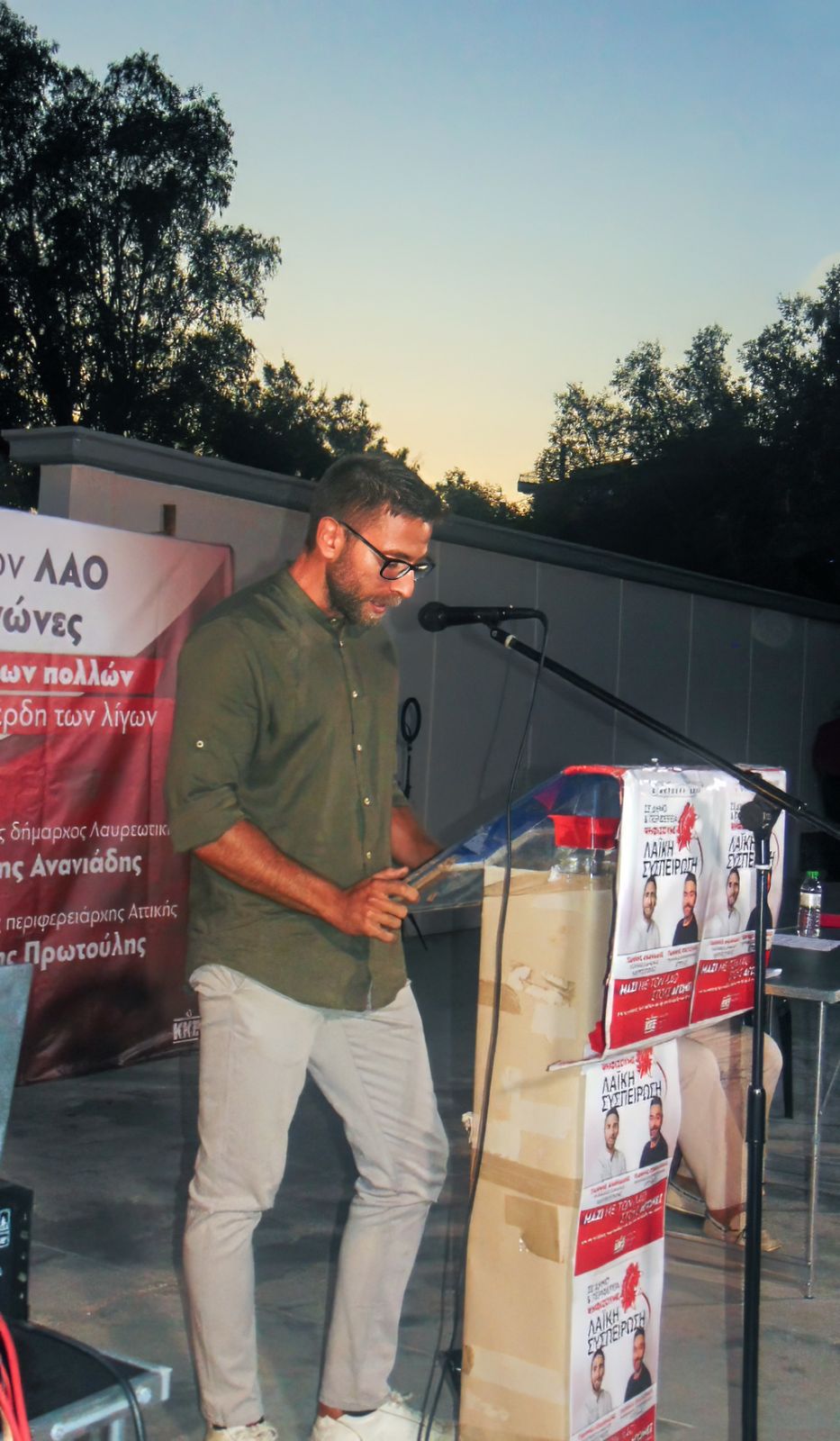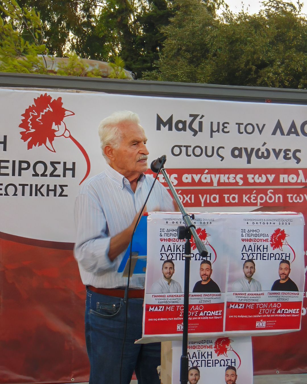 Στην συγκέντρωση παρευρέθηκε και έκανε χαιρετισμό ο Γιάννης Πρωτούλης, Υποψήφιος Περιφερειάρχης Αττικής με τη Λαϊκή Συσπείρωση, μέλος του ΠΓ της ΚΕ του ΚΚΕ.